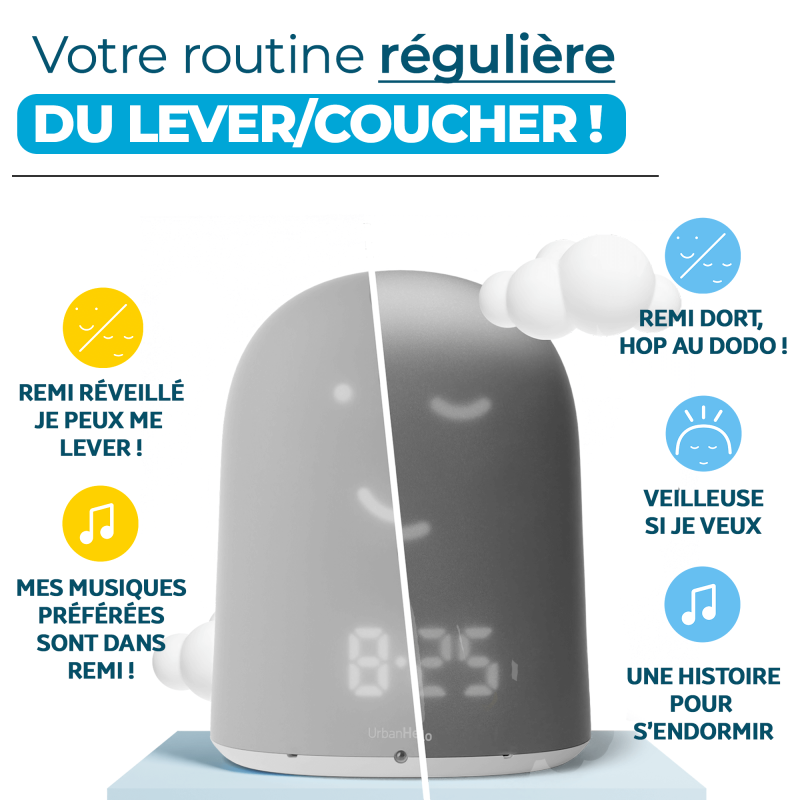 REMI es un despertador con luz nocturna de nueva generación, diseñado para acompañar a tu hijo desde el nacimiento hasta los 10 años.